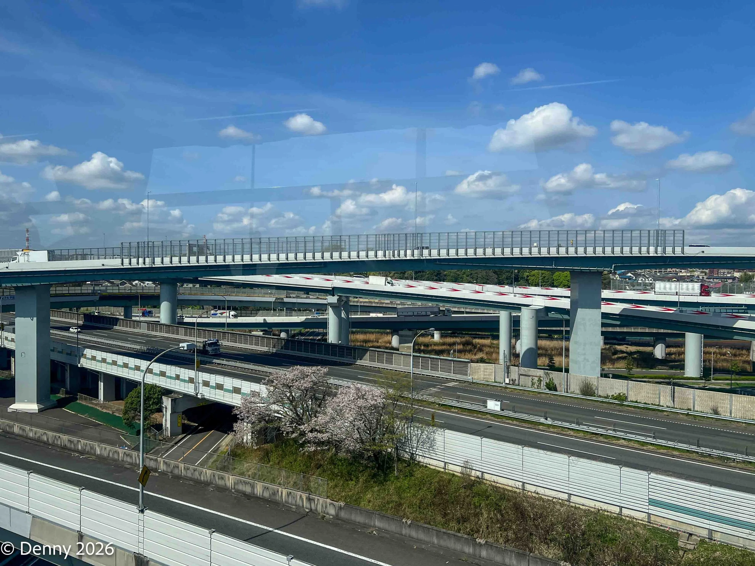 Clover leaf roads (note chery blossom) en route from Tokyo to Fukasawa