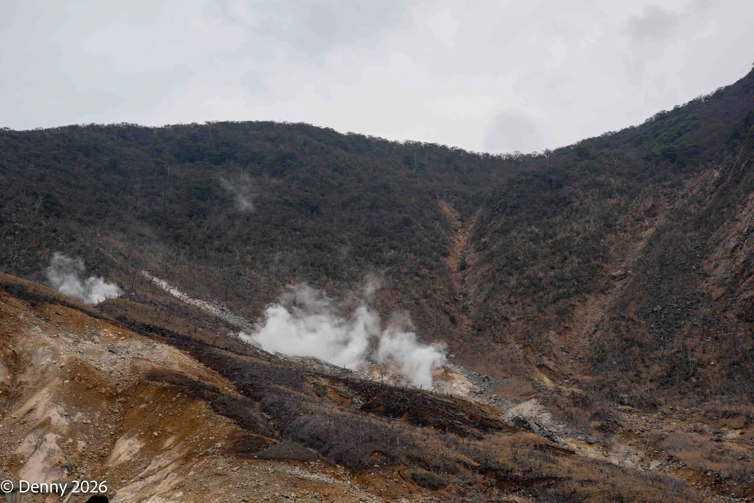 The Hakone area extends across the collapsed remains of a huge volcano which was active until about 3000 years ago. This volcanic origin explains the geothermal activity present today with the hot springs, steam vents and of yellow sulfur covering some rocks on the hillside.