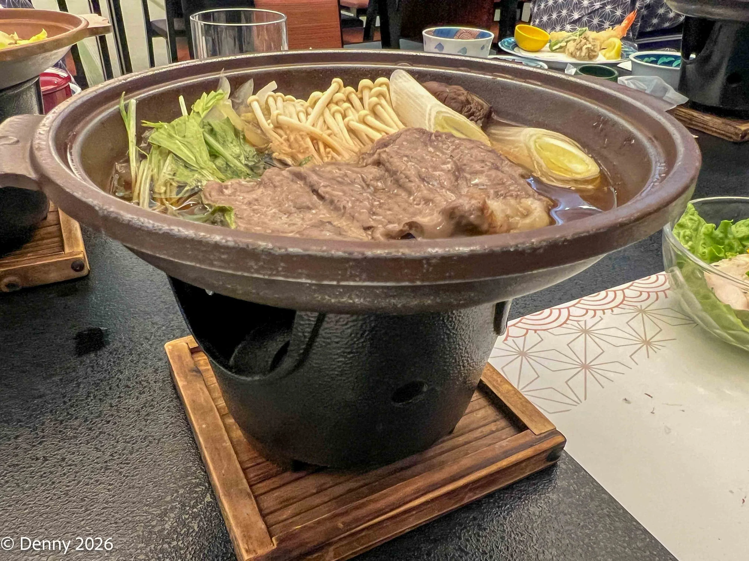 The sashimi tuna and salmon dipped in soy sauce and spiced further with wasabi was a delectable treat. The thinly sliced beef pieces cooked in the hot-pot with vegetables, noodles and mushrooms were very tender and tasty.
