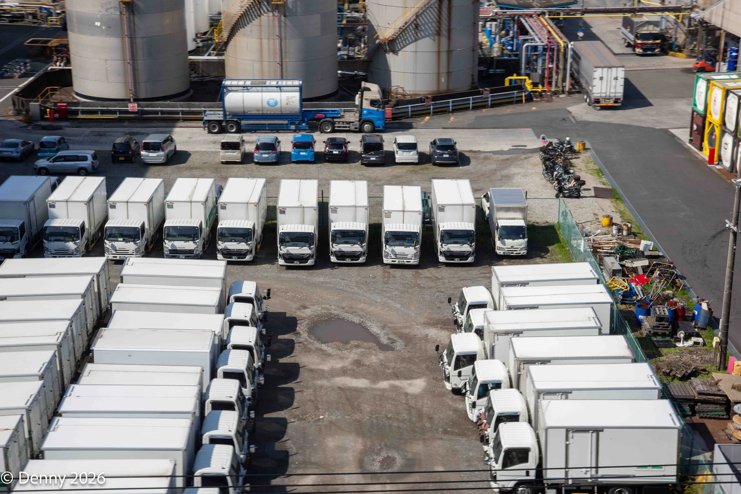 Trucks in yard en route from Tokyo to Fukasawa